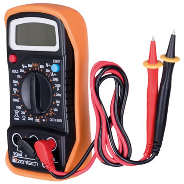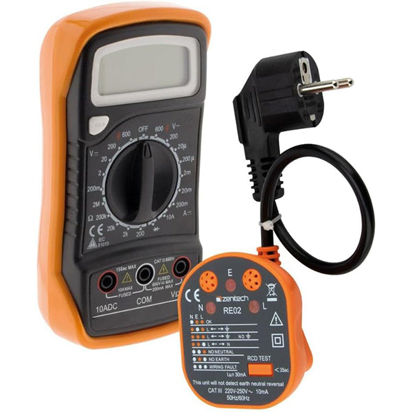 Multimètre digital 5 fonctions livré avec un testeur de prise pour contrôler vos installations électriques. Il mesure tensions AC/DC jusqu’à 600 V, courant jusqu’à 10 A et résistance jusqu’à 2 MΩ. Son grand écran LCD assure une lecture confortable et la fonction Hold permet de figer les valeurs. Compact, simple à utiliser et conforme à la norme de sécurité CAT III 600 V, il convient aussi bien aux bricoleurs qu’aux installations domestiques.