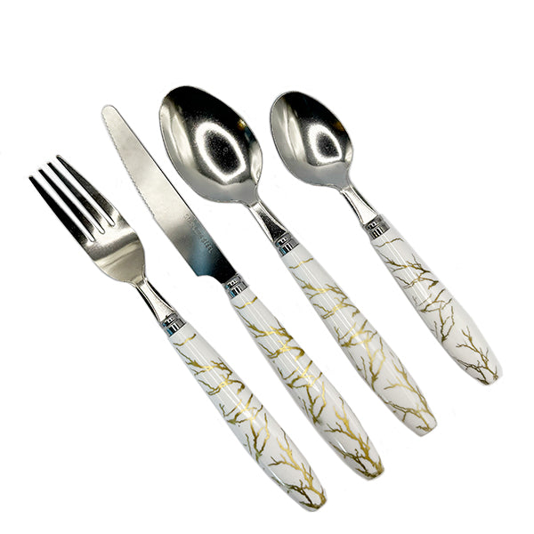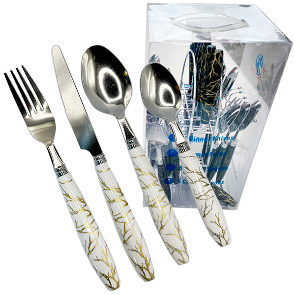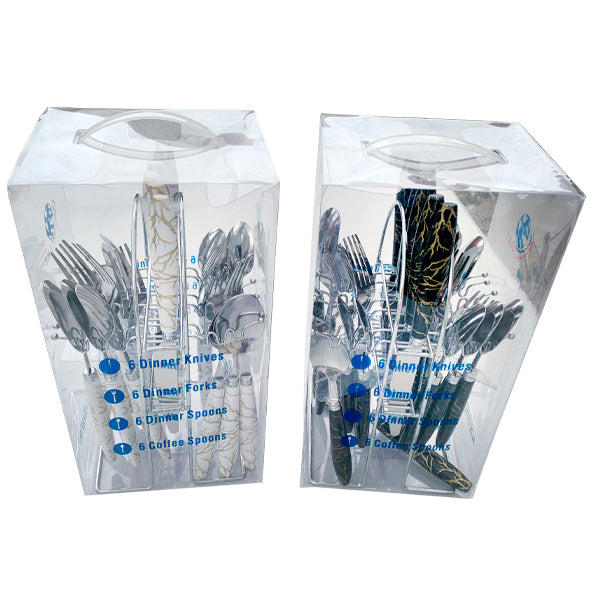 Cette ménagère 24 pièces est pensée pour le quotidien Elle comprend 6 fourchettes, 6 couteaux, 6 cuillères à soupe et 6 cuillères à café : tout ce qu’il faut pour partager un bon repas en famille ou entre amis. C’est aussi une belle idée pour une crémaillère ou pour bien démarrer dans un nouveau logement. Coloris différents selon les arrivages.